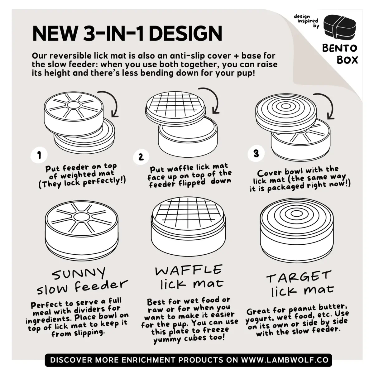 - Combine les motifs classiques des tapis à lécher en deux niveaux de difficulté, en plus d’un design à alimentation lente. Vous pouvez utiliser les deux éléments de 3 manières différentes (voir l’image d’instructions)