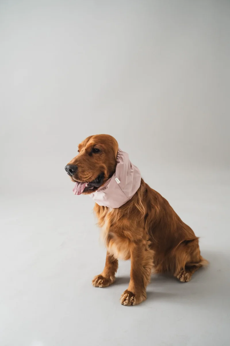 Un snood imperméable rose qui protège les oreilles et le cou de ton chien contre pluie, humidité, saletés et épillets.